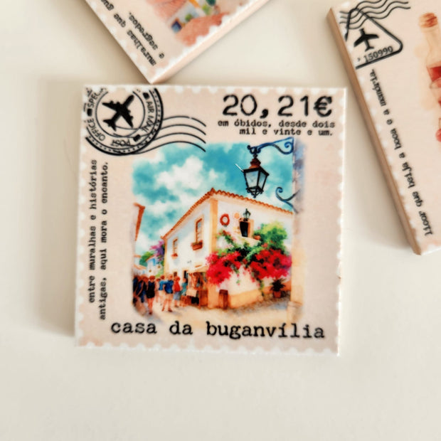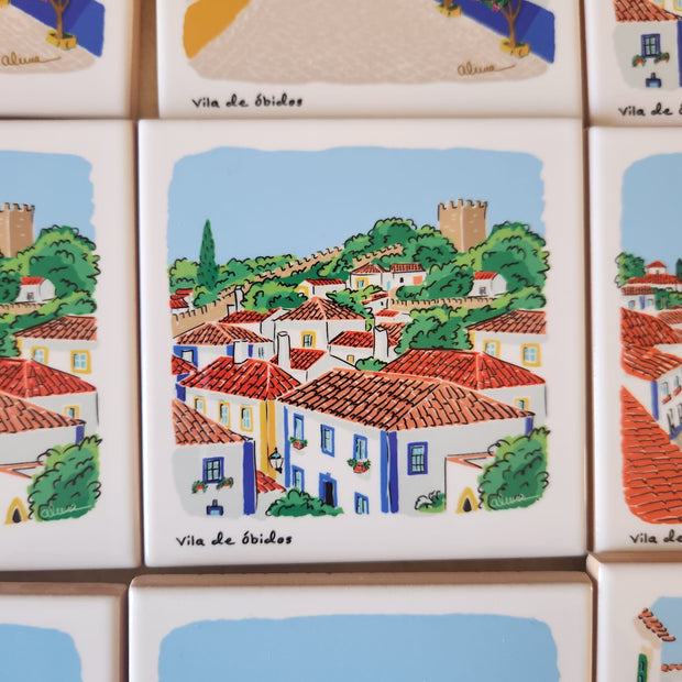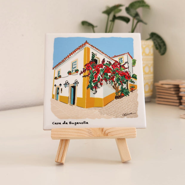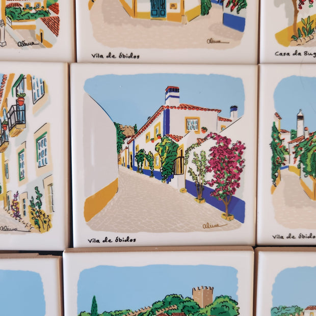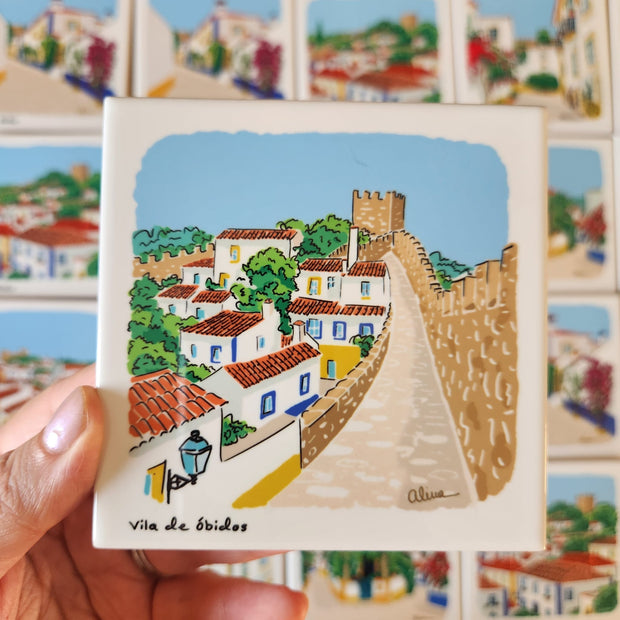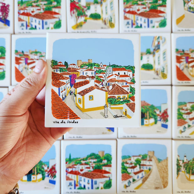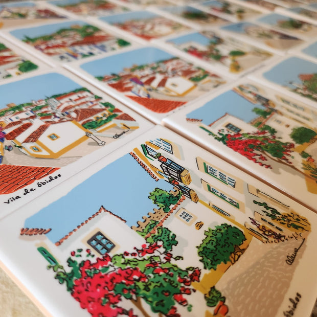 Cada rua conta um segredo, cada janela guarda um verso, cada flor borda silêncio no ar. Deste sentimento nasceu esta coleção: azulejos pintados à mão, digitalmente, como quem traduz a alma da vila em cor. Não são fotografias — são memórias sussurradas em traços e cor.