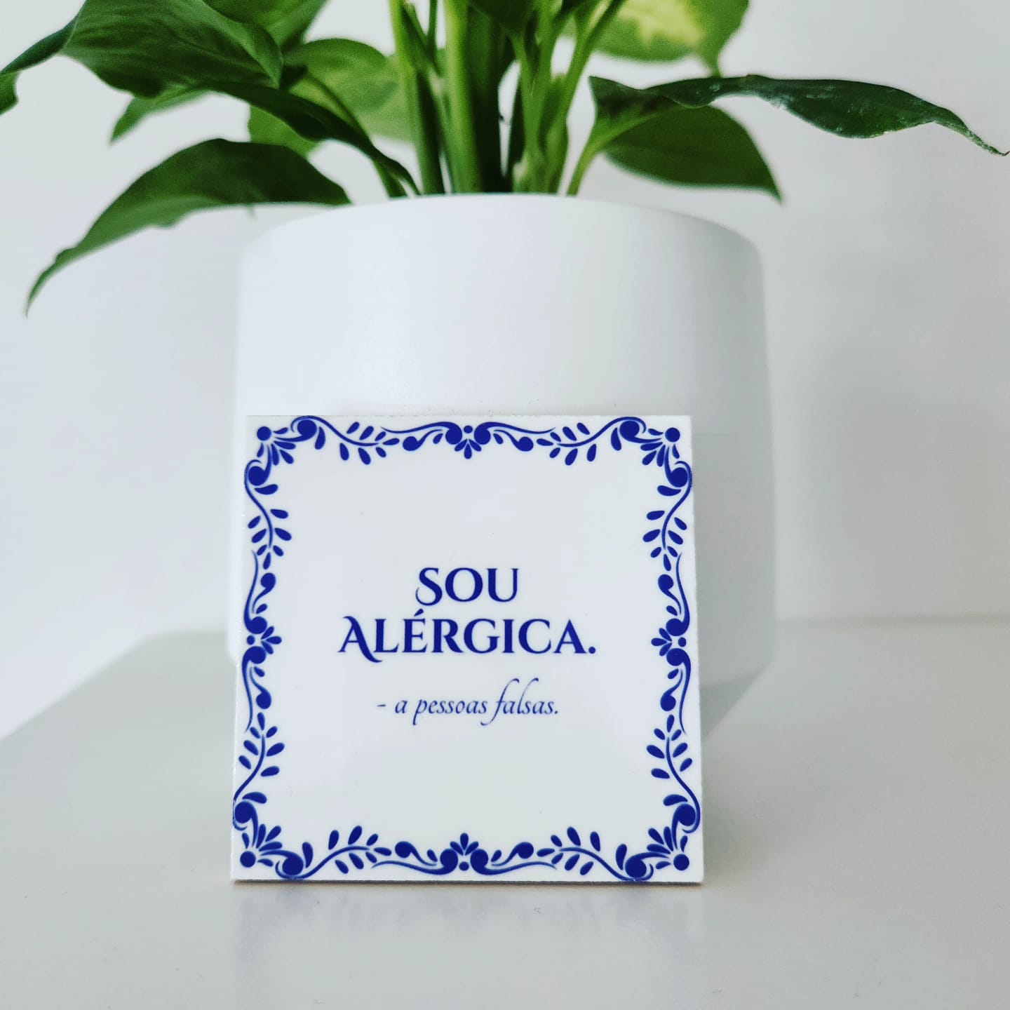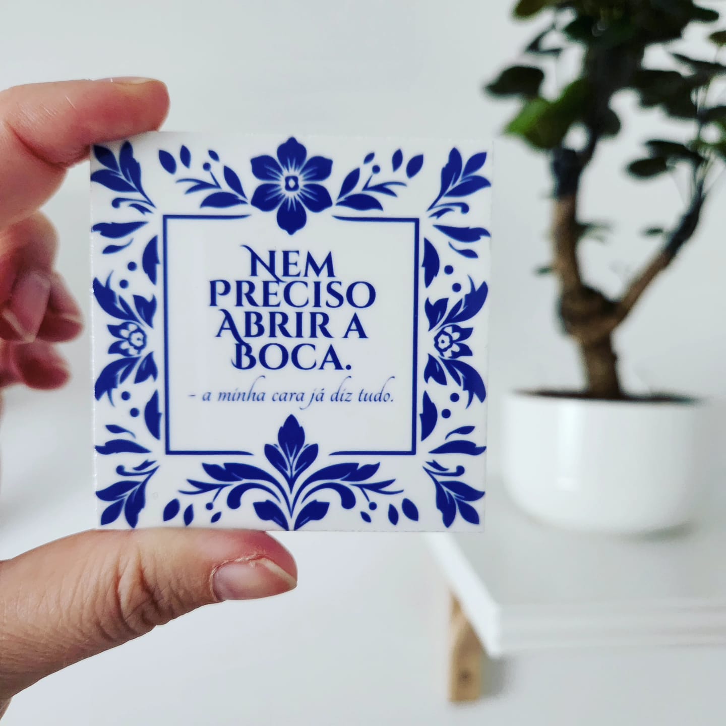 Podes escolher entre várias frases prontas (sarcasmo incluído) ou personalizar com a tua própria ideia, criando uma peça única que reflete a tua voz. Também podes complementar com suportes opcionais, como cavaletes, molduras de madeira ou bases de cortiça, para dar ainda mais destaque ao teu azulejo.